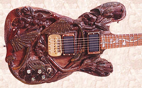 The HeadStock I Carved like the Leaves with a Blue Mahoe FacePlate!  I Inlaid & Etched a Doctor Bird Feeding on a Flower on the Truss Rod Cover that Completes the FlowerVine from the FingerBoard!!!  The Eye of the Doctor is Garnet & the Long Double Tail Flows around the Mini Black Grover!!!  The Nut is CowBone!!!