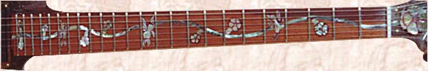 I Inlaid & Etched the FingerBoard with Abalone FlowerVine & DoctorBirds at the 5th, 12th & 19th Frets & Flowers at the Others & 2 Flowers at the 24th!!!  The Truss Rod Cover I Inlaid with Flower that the Doctor Bird is Feeding On!!!  Abalone Side Dots!