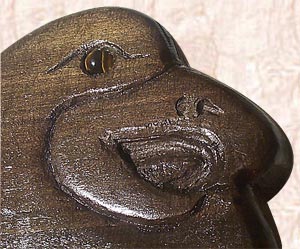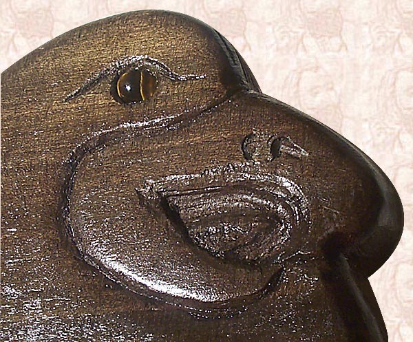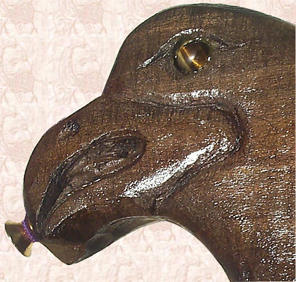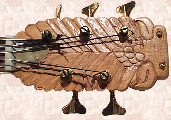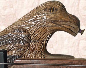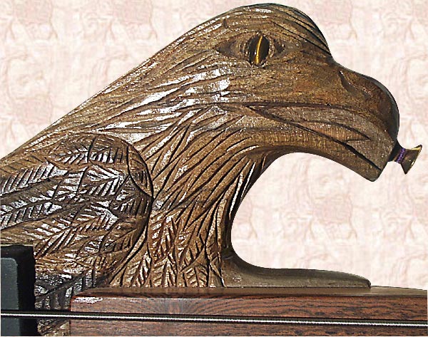 I Carved Pair of Eagles 5-String Fretless Bass Guitar from BLUE MAHOE--a Beautiful Greenish-Blue-Purple  Wood of JAMAICA--& Carved Faces Both Sides!!!  The Eyes are Tiger's Eyes with Maple & Walnut Knobs!  Pair of Eagles is Powered By Pair of Seymour Duncan 5-String Active PickUps, with Gold HardWare!!!