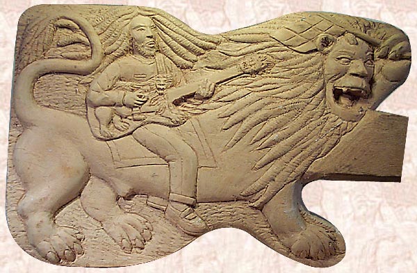 Carved in Yellow Tamarind BOBBY'S ROARIN' LION is MARLEY  Riding a LION Playing a Guitar that Looks Like BOB Riding a LION Playing a Guitar that Looks Like BOB Riding a Lion... a PICTURE in a PICTURE in a PICTURE...Really Opens the DOOR to WHAT WE Can DREAM OF to MAKE an INSTRUMENT SPECIALLY FOR YOU!!!  DREAM WILDE & I CARVE & INLAY YOUR WILDEST IMAGINATIONS!!!