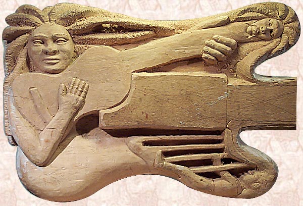 Carved from YELLOW TAMARIND, MOTHER is PLAYING GUITAR with FATHER CARVED on HEADSTOCK SINGING to BABY PLAYING HARP!!!  LOVE & FAMILY IS BEAUTIFUL!!!  PEACE & LOVE!!!  If you have FAMILY I Carve & Inlay for YOU!!!