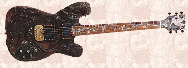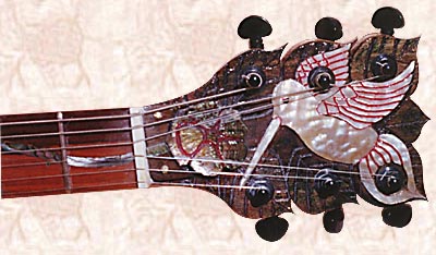 The HeadStock I Carved like the Leaves with a Blue Mahoe FacePlate!  I Inlaid & Etched a Doctor Bird Feeding on a Flower on the Truss Rod Cover that Completes the FlowerVine from the FingerBoard!!!  The Eye of the Doctor is Garnet & the Long Double Tail Flows around the Mini Black Grover!!!  The Nut is CowBone!!!