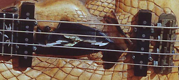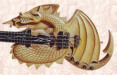 The Dragon is Flying Grasping at the Arrow with Feathers Carved into HeadStock & Arrow Point into the Body!!!  The PickUps are Seymour Duncans & the BRIDGE My Making!!! The Ebony Knobs I Inlaid with White Bursts of Flame for Volume & Coloured for Tone!!!