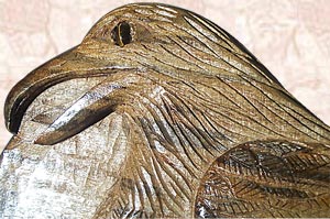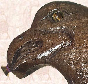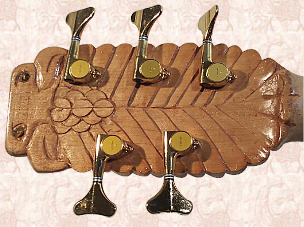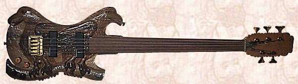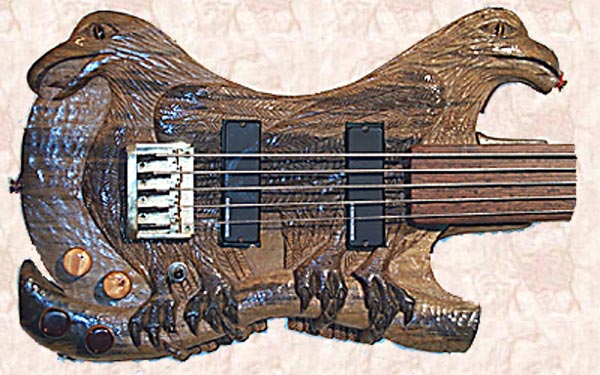I Carved Pair of Eagles 5-String Fretless Bass Guitar from BLUE MAHOE--a Beautiful Greenish-Blue-Purple  Wood of JAMAICA--& Carved Faces Both Sides!!!  The Eyes are Tiger's Eyes with Maple & Walnut Knobs!  Pair of Eagles is Powered By Pair of Seymour Duncan 5-String Active PickUps, with Gold HardWare!!!